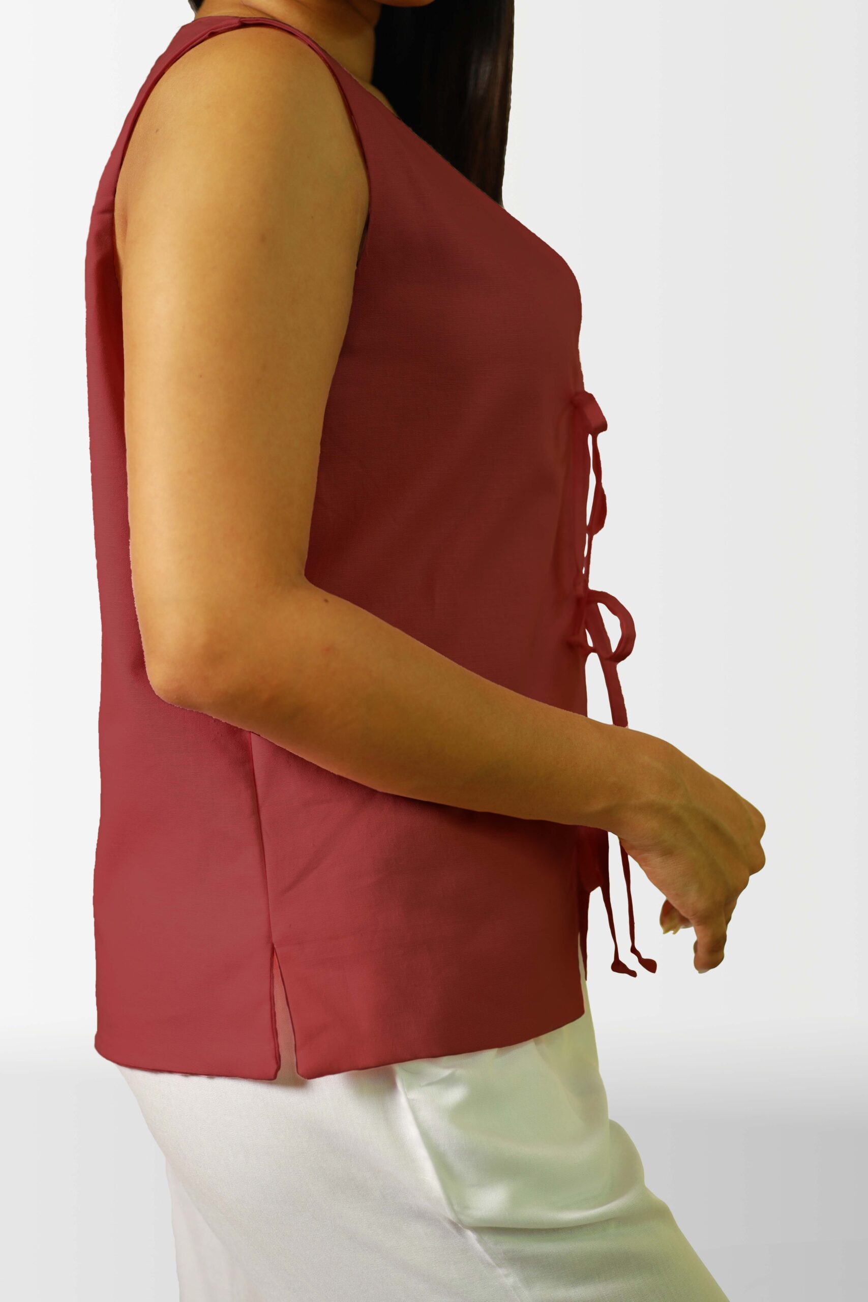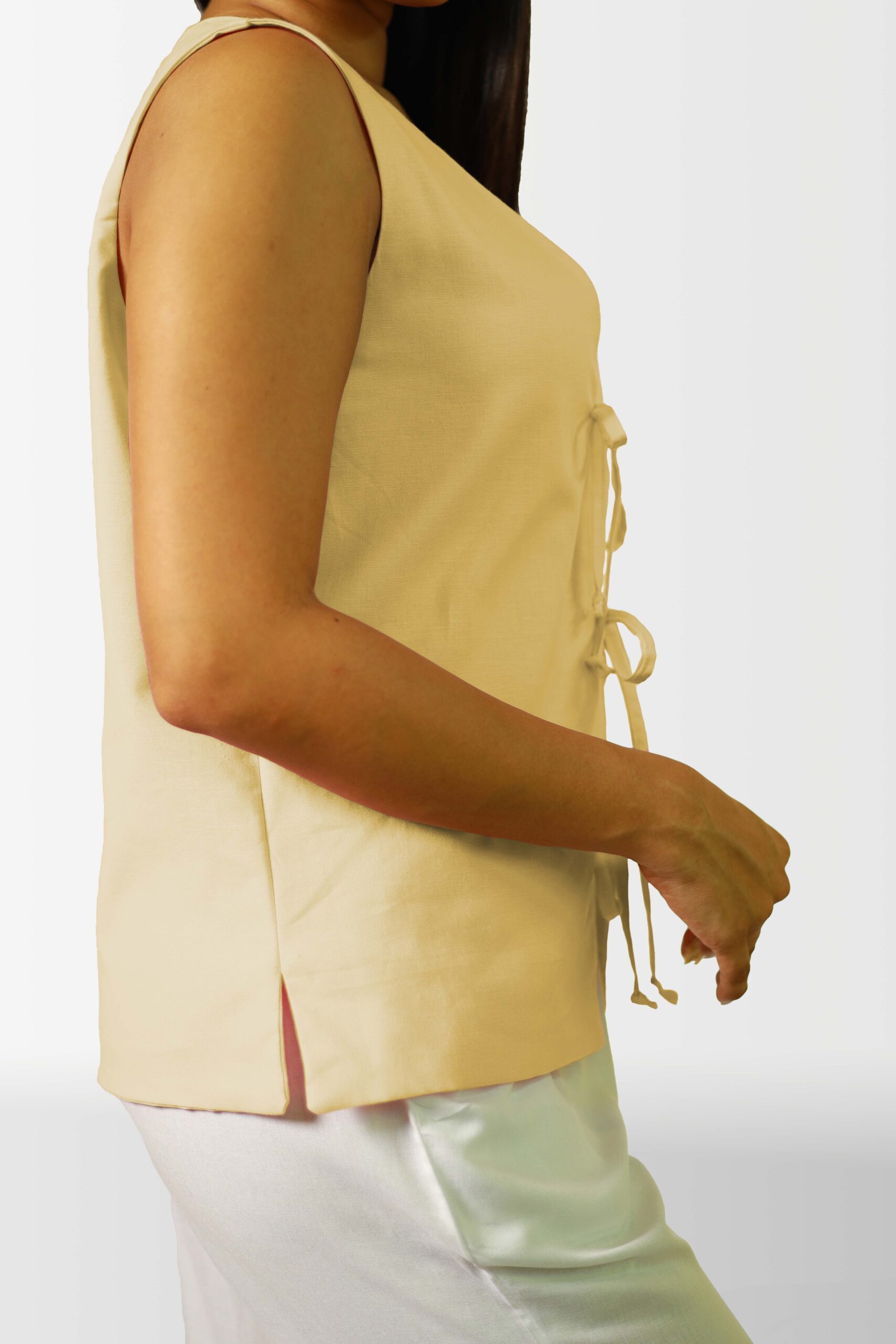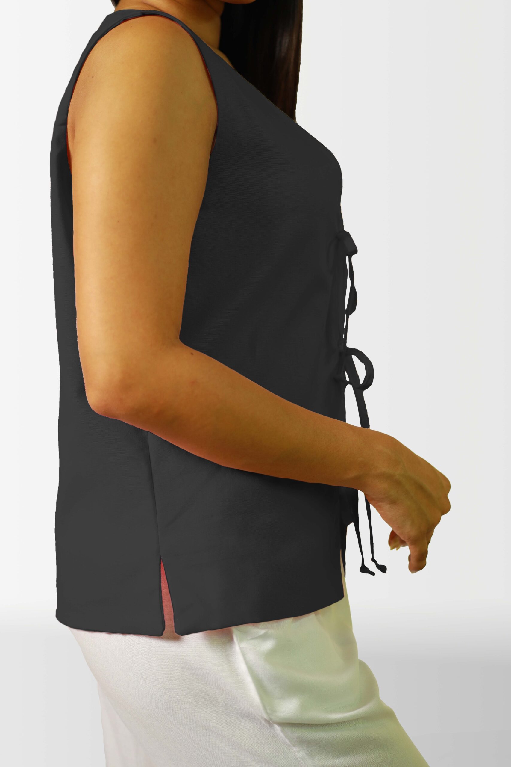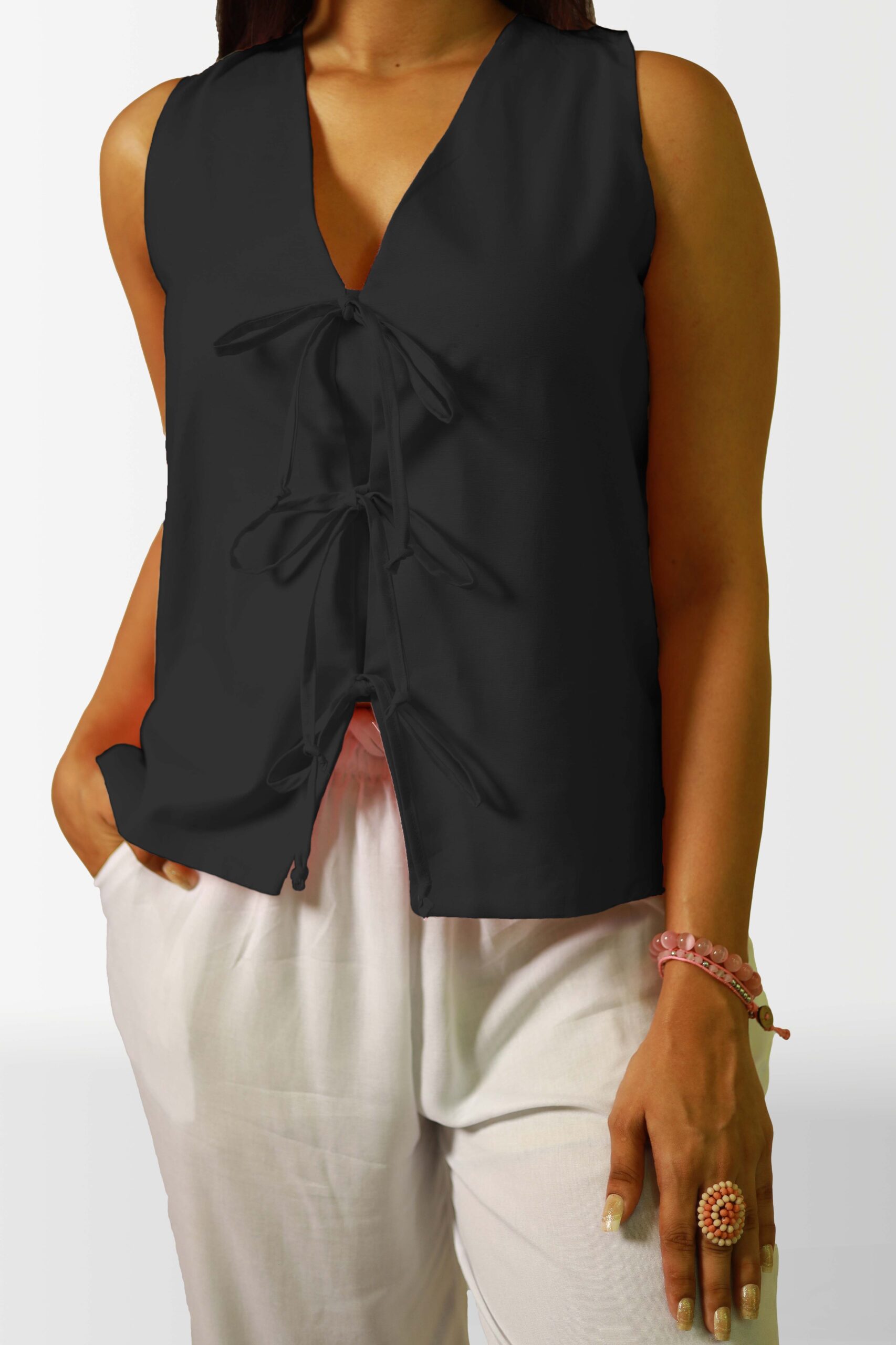 Add a touch of unique style to your wardrobe with this sleeveless top. The eye-catching tie-front design not only creates a flattering silhouette but also adds an interesting visual element. Crafted from a soft and breathable fabric, this top is perfect for warm weather and can be easily dressed up or down.