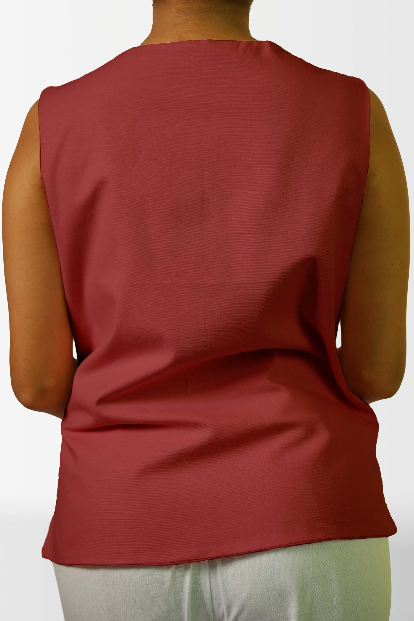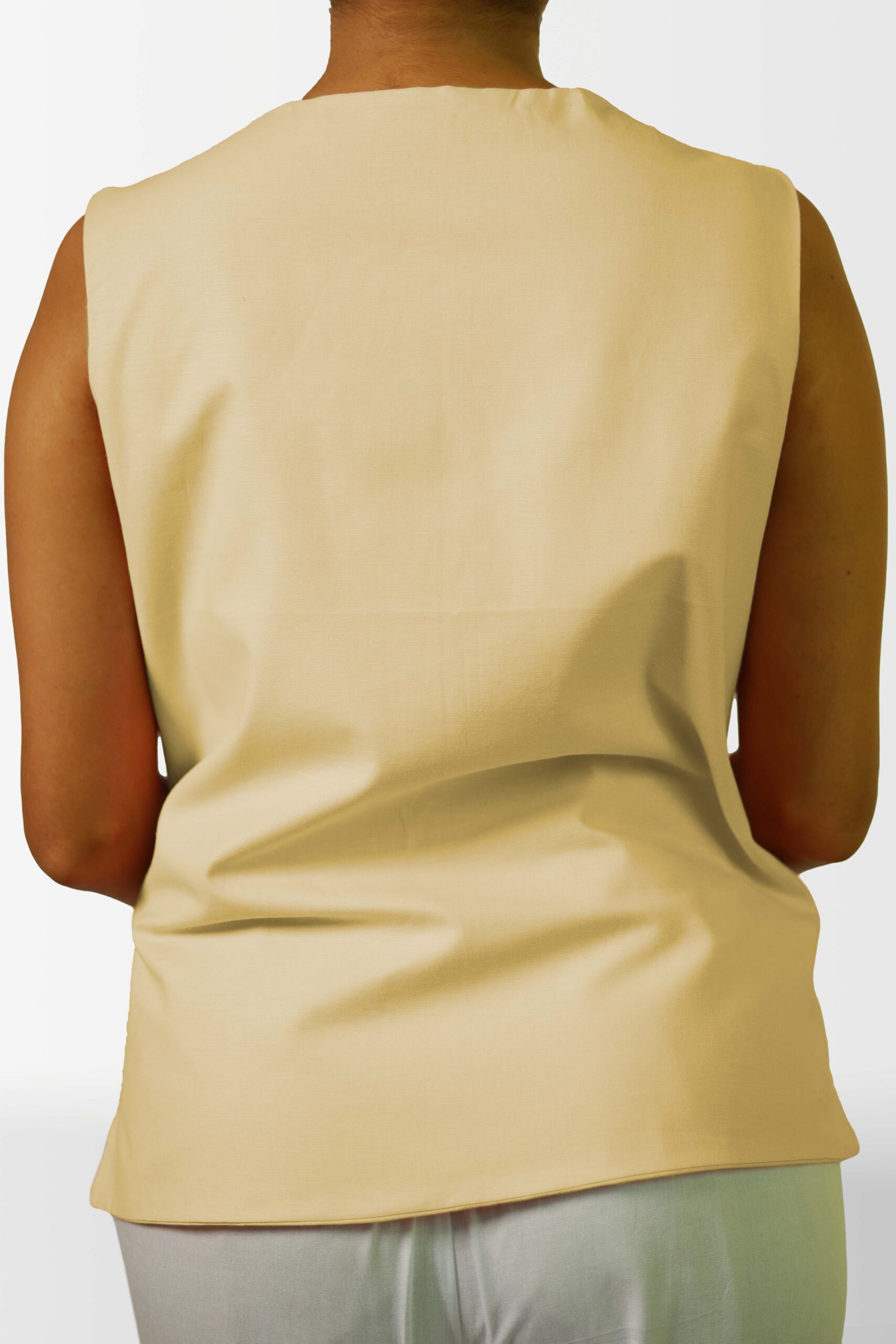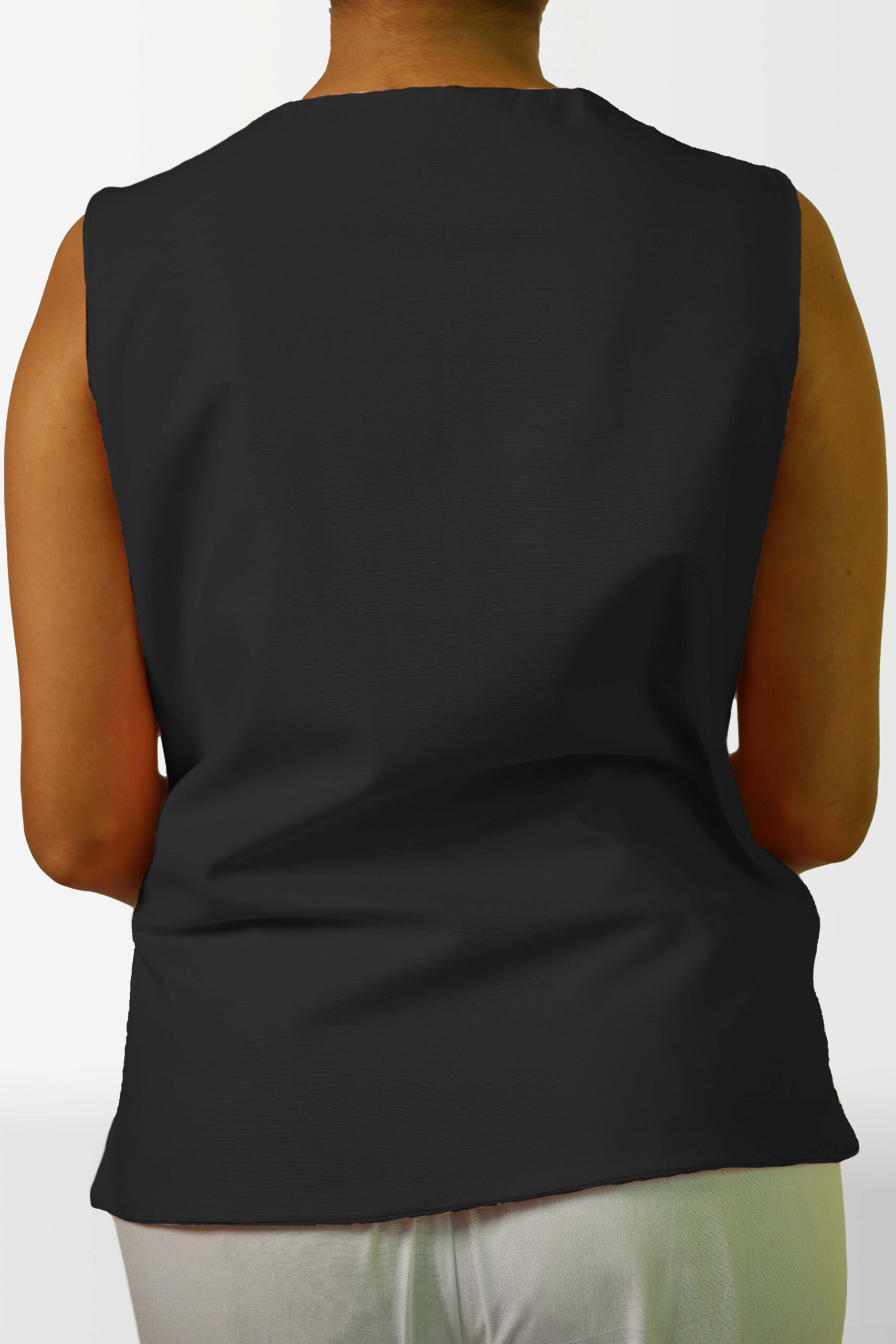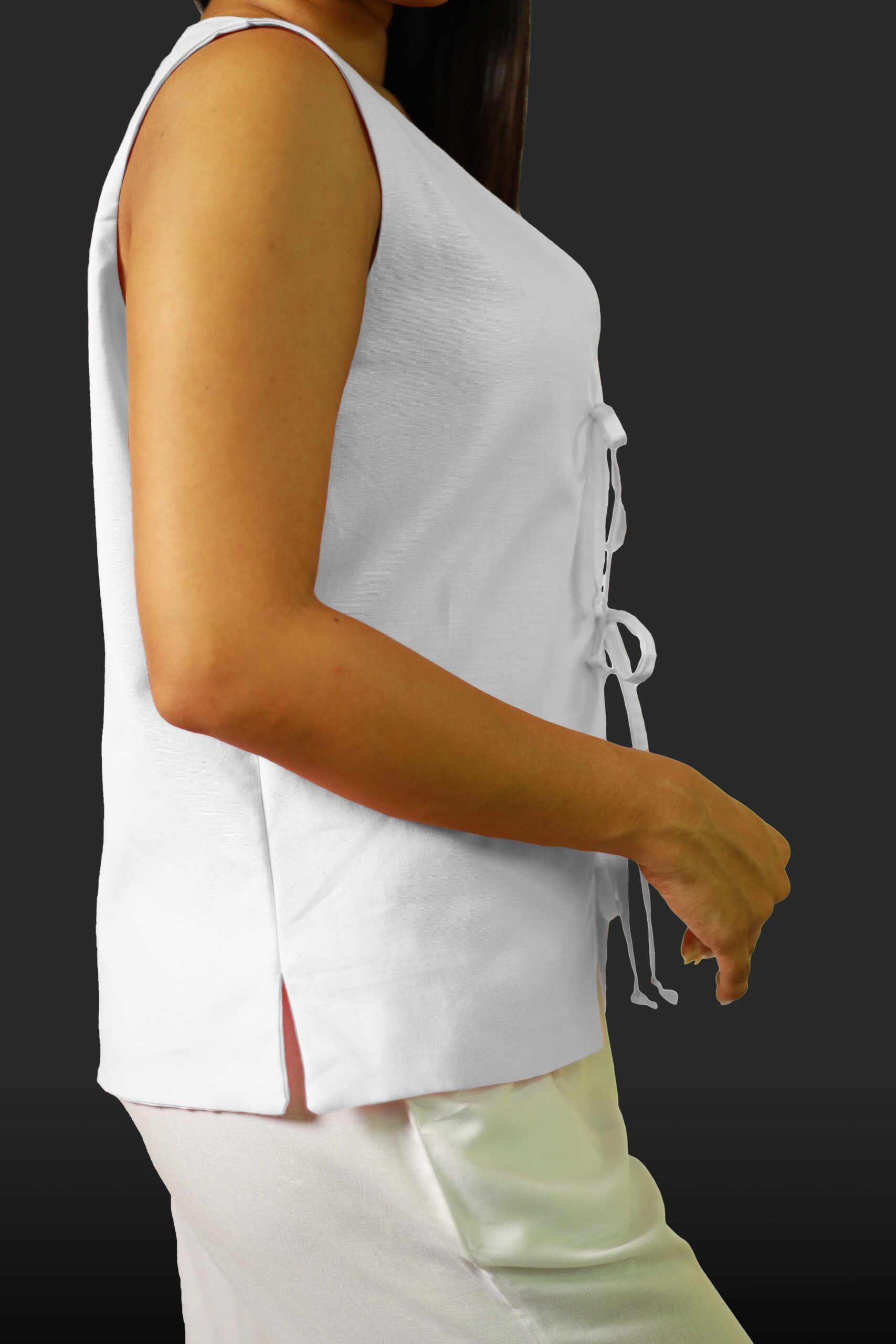 Add a touch of unique style to your wardrobe with this sleeveless top. The eye-catching tie-front design not only creates a flattering silhouette but also adds an interesting visual element. Crafted from a soft and breathable fabric, this top is perfect for warm weather and can be easily dressed up or down.